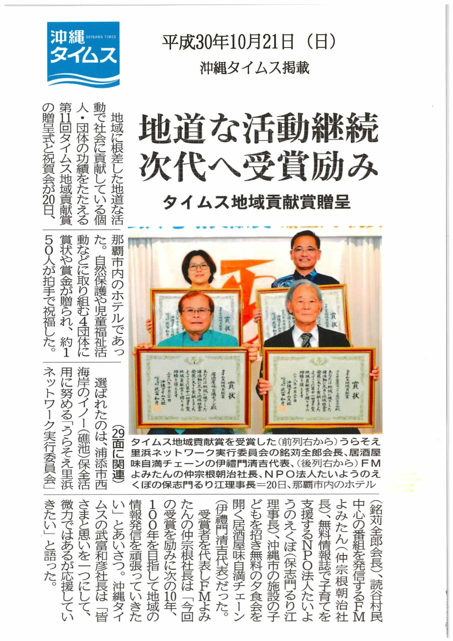2018年 沖縄タイムス社 第11回タイムス地域貢献賞受賞