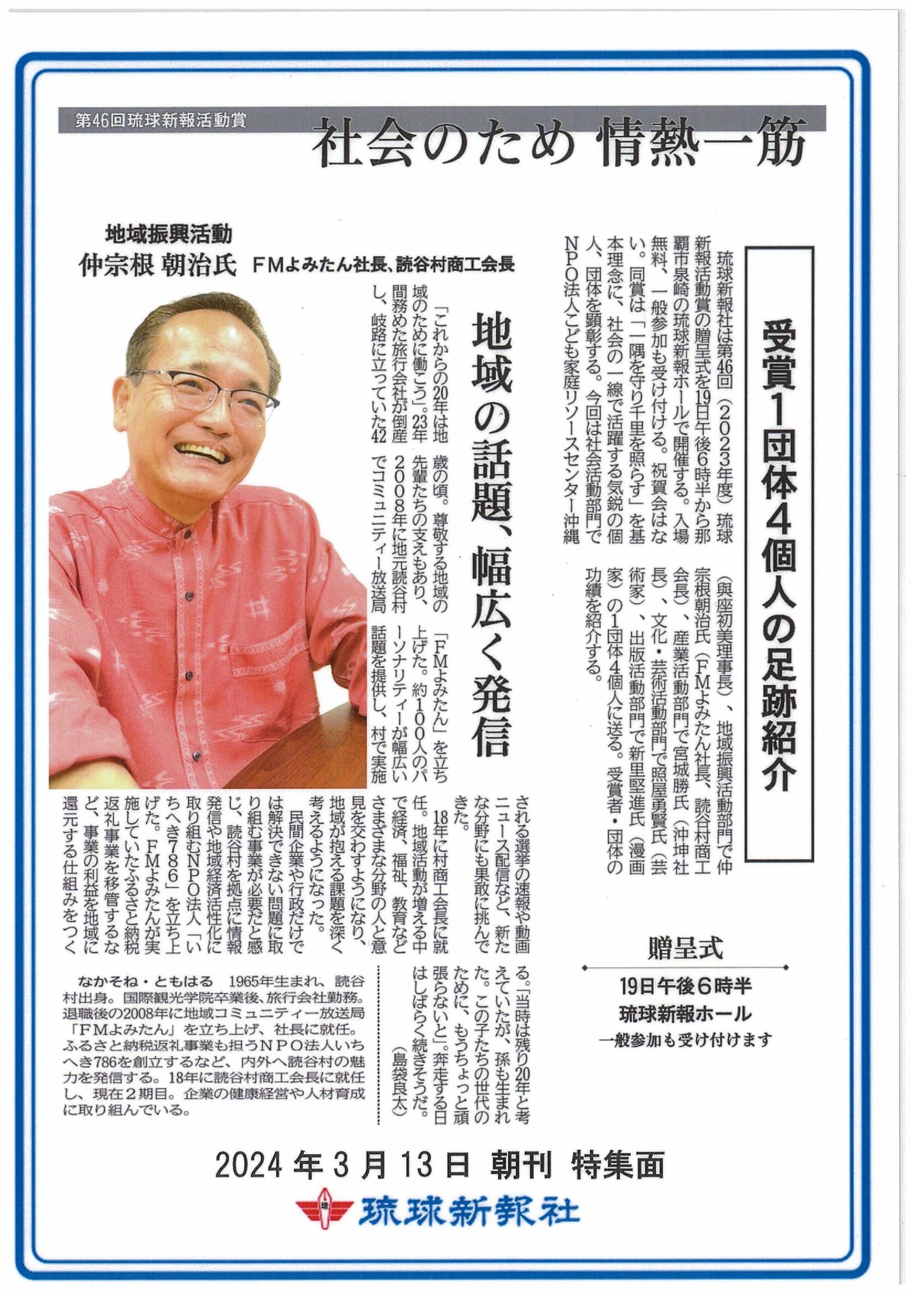 2024年 第46回琉球新報地域活動賞 受賞